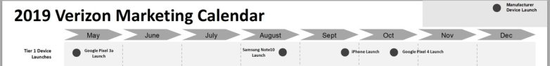 Thông tin rò rỉ từ nhà mạng Mỹ mới đây có thể hé lộ về thời điểm những chiếc iPhone thế hệ tiếp theo của Apple sẽ được đưa lên kệ. Cụ thể, cây viết Evan Blass của VentureBeat đã có trong tai một lộ trình marketing của nhà mạng Verizon trong đó có nhắc đến việc iPhone mới sẽ được bán ra vào tháng 9 tới. Bên cạnh đó, thông tin rò rỉ cũng nói rằng Google Pixel 3a, Samsung Galaxy Note 10 và Google Pixel 4 sẽ lần lượt được bán ra vào tháng 5, tháng 8 và tháng 10.