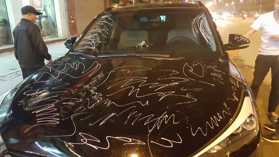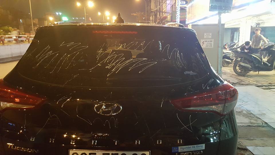 Cận cảnh người phụ nữ dùng bút xoá vẽ lên xe ô tô. Nguồn: Nguyễn Trọng Tùng