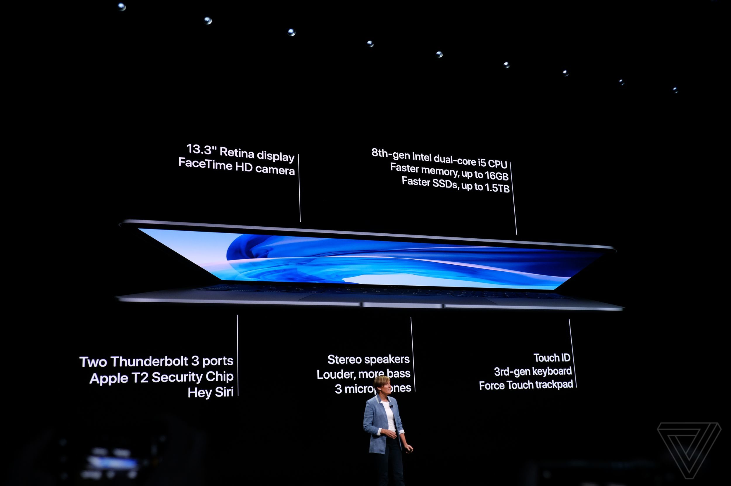 MacBook Air lúc này cũng có bàn phím thế hệ mới nhất của Apple cùng với đó là touchpad mang công nghệ ForceTouch với kích thước lớn hơn 20% so với thiết bị tiền nhiệm. Được biết, MacBook Air mới sẽ được trang bị CPU hai nhân Intel thế hệ 8. Phiên bản MacBook Air mới với RAM 8 GB, chip Core i5 1,6 GHz cùng 128 GB bộ nhớ trong sẽ có giá 1.199 USD đồng thời bắt đầu lên kệ từ ngày 7 tháng 11 tới.