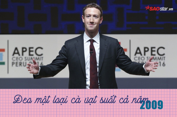 Mark Zuckerberg vốn là một người nổi tiếng ăn mặc khá thoải mái với những chiếc quần jeans, áo hoodies hay T-shirt trơn tối màu. Thế nhưng, có một thời điểm ông chủ Facebook lại ăn mặc khá nghiêm túc. Đó là vào năm 2009, khi mục tiêu trong năm mới của tỷ phú trẻ tuổi là đeo một loại cà vạt trong suốt cả một năm.
