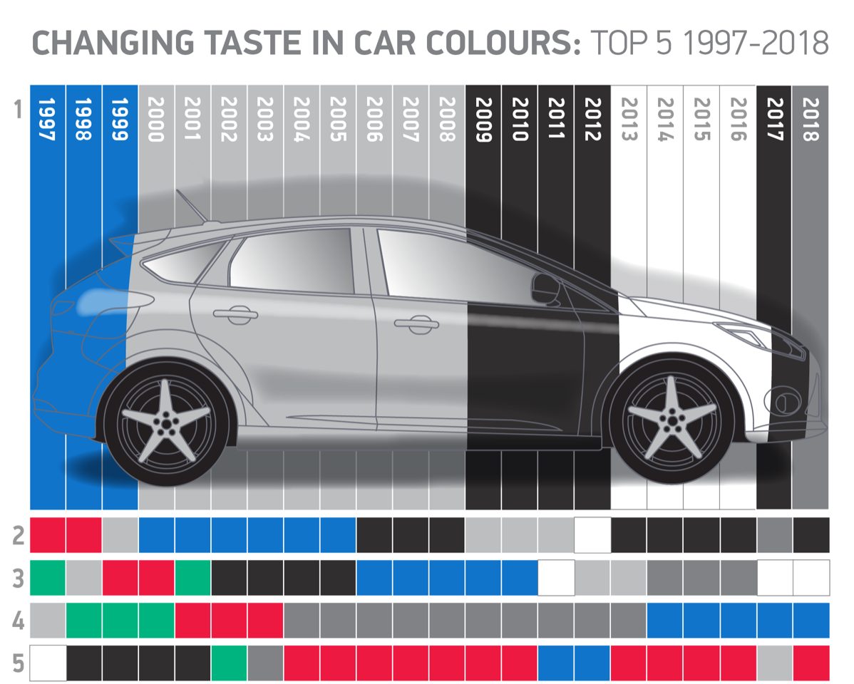 Theo thống kê của Hiệp hội các nhà sản xuất và giao thương xe Anh Quốc ( Society of Motor Manufacturers and Traders) từ năm 2011 trở lại đây, xám, đen, trắng là 3 tông màu được ưa chuộng nhất với tỉ lệ 59% người mua.