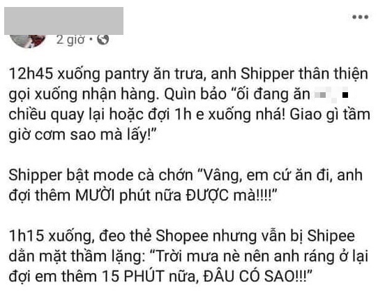 Mới đây, sự việc một tài khoản tự nhận mình là nhân viên Shopee bắt nhân viên giao hàng phải chờ đợi 30 phút rồi mới xuống nhận đã tạo ra làn sóng phản ứng mạnh mẽ trên mạng xã hội.