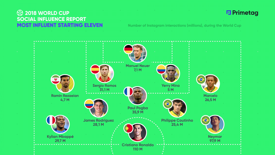 Mặc dù Brazil chiến thắng về tổng số lượt tương tác, Cristiano Ronaldo là là nhà vô địch về sức ảnh hưởng trên phương diện cá nhân. Cầu thủ người Bồ Đào Nha này đã nhận được 110 triệu lượt tương tác trên Instagram, đẩy Neymar (Brazil) và Paul Pogba (Pháp) về vị trí số hai và số ba với số lượt tương tác lần lượt là 97,9 triệu và 35,9 triệu.