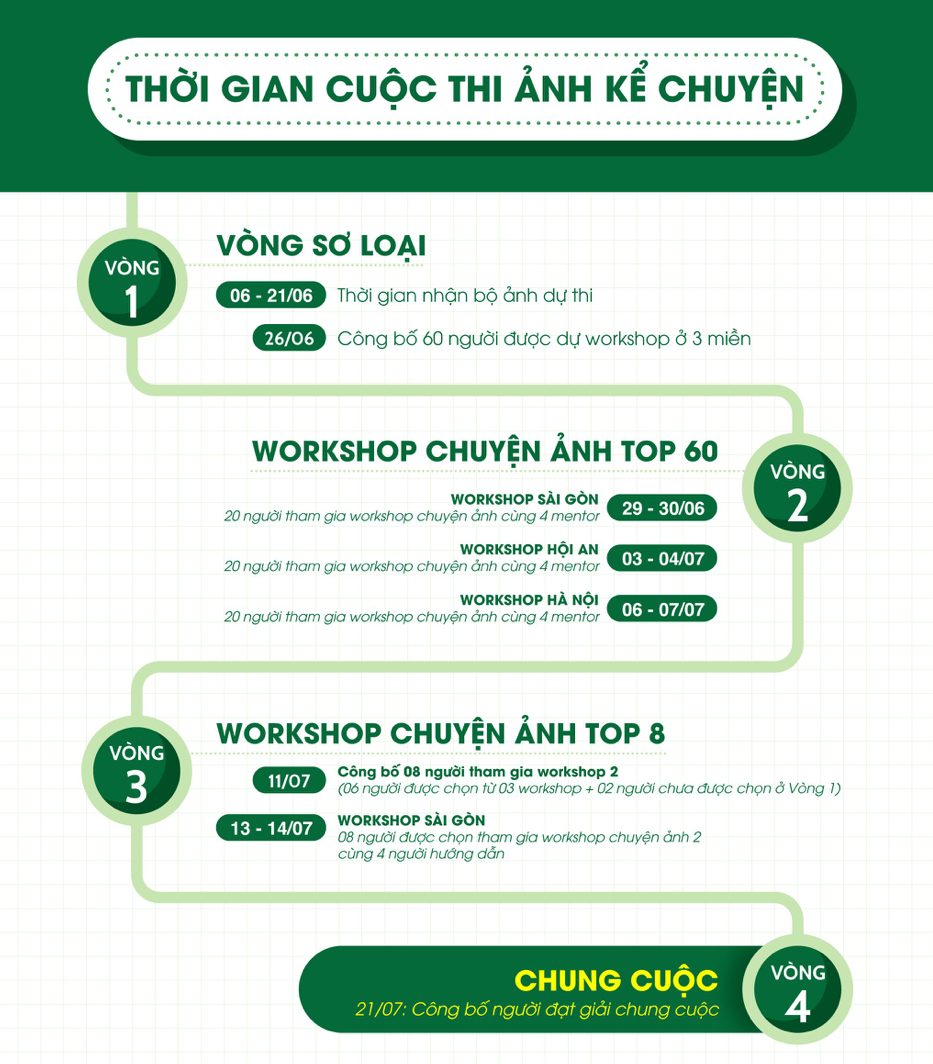 Cuộc thi trải qua 3 vòng, với các workshop nhiếp ảnh đan xen, hứa hẹn sẽ là sân chơi bổ ích cho giới yêu nhiếp ảnh trẻ Việt Nam.