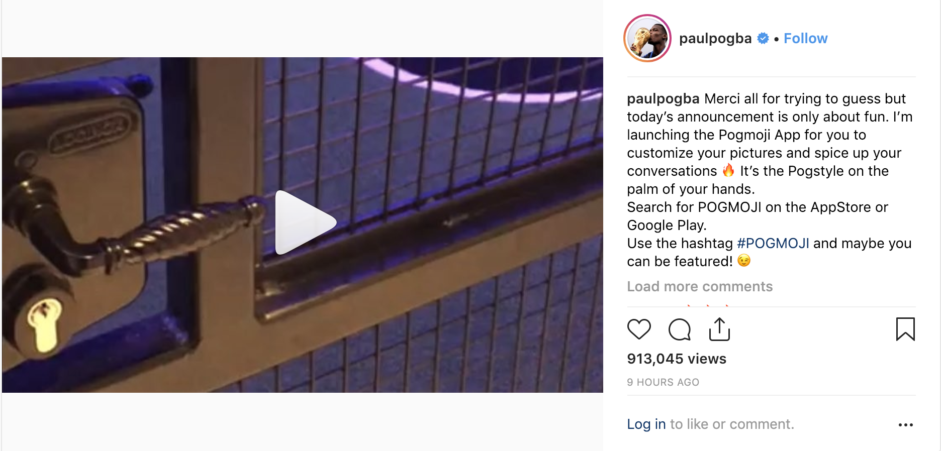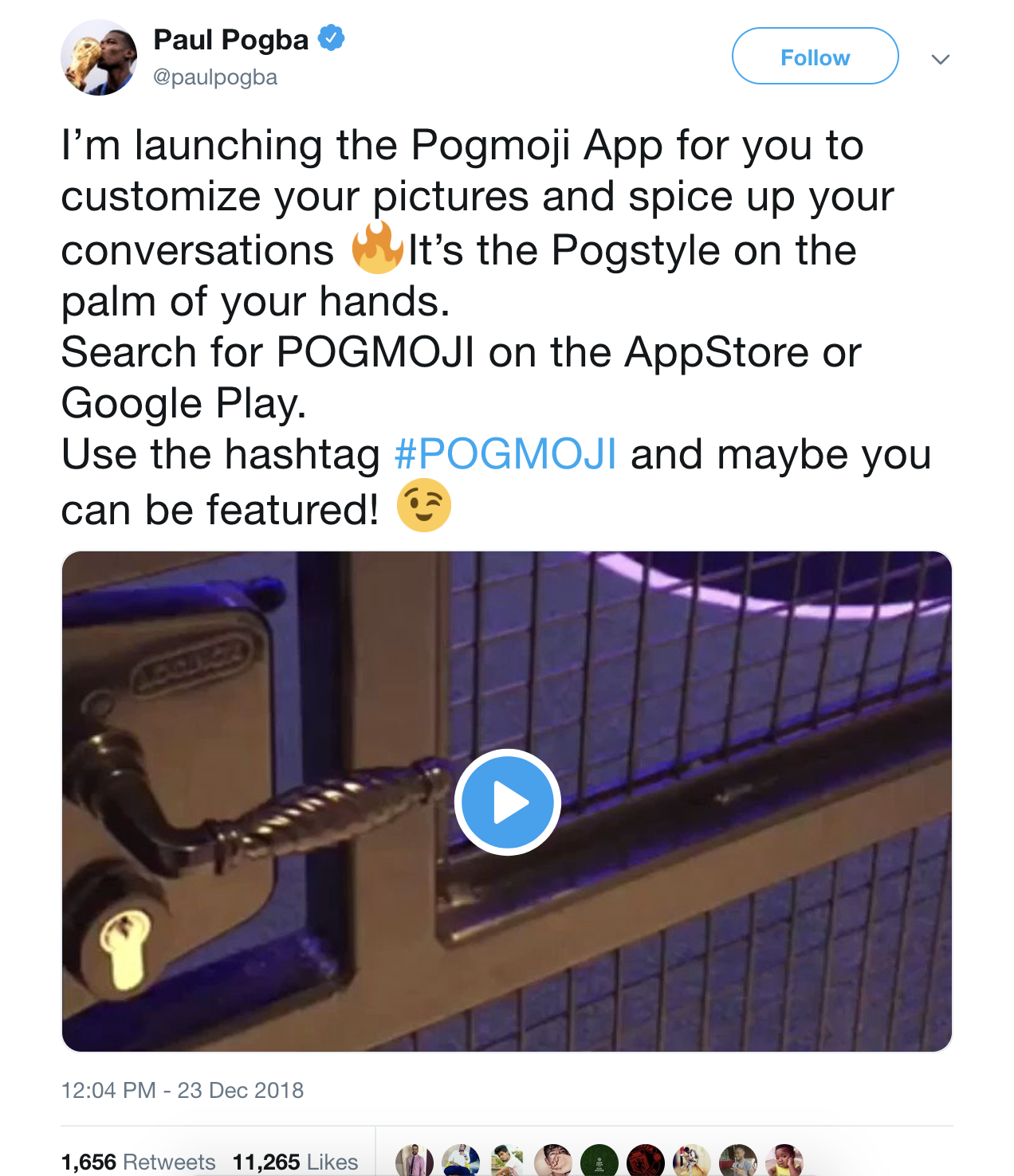 “Tôi đã bắt tay cùng những người lập trình để ra mắt Pogmoji App, một ứng dụng điện thoại giúp các bạn có thể tùy chỉnh những bức ảnh và thêm phần thú vị cho những cuộc hội thoại của mình. Giờ đây, Pogstyle, phong cách của Pogba đang nằm ngay trong lòng bàn tay của các bạn. Hãy tìm kiếm POGMOJI trên AppStore và Google Play nhé” - Pogba mời gọi.