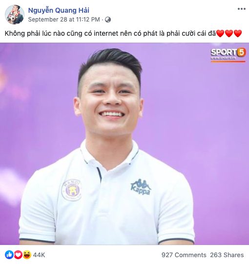 “Không phải lúc nào cũng có internet nên có phát là phải cười cái đã,” Quang Hải viết trên trang cá nhân trong một bài đăng anh nhận được tới 44.000 người nhấn like và gần một nghìn bình luận. Nội dung nghe thì có vẻ vô lý nhưng hoàn toàn hợp lý này được Quang Hải cập nhật từ Bình Nhưỡng, CHDCND Triều Tiên khi anh và các đồng đội trong CLB Hà Nội FC chuẩn bị cho trận chung kết lượt về liên khu vực AFC Cup 2019 với CLB 25-4.