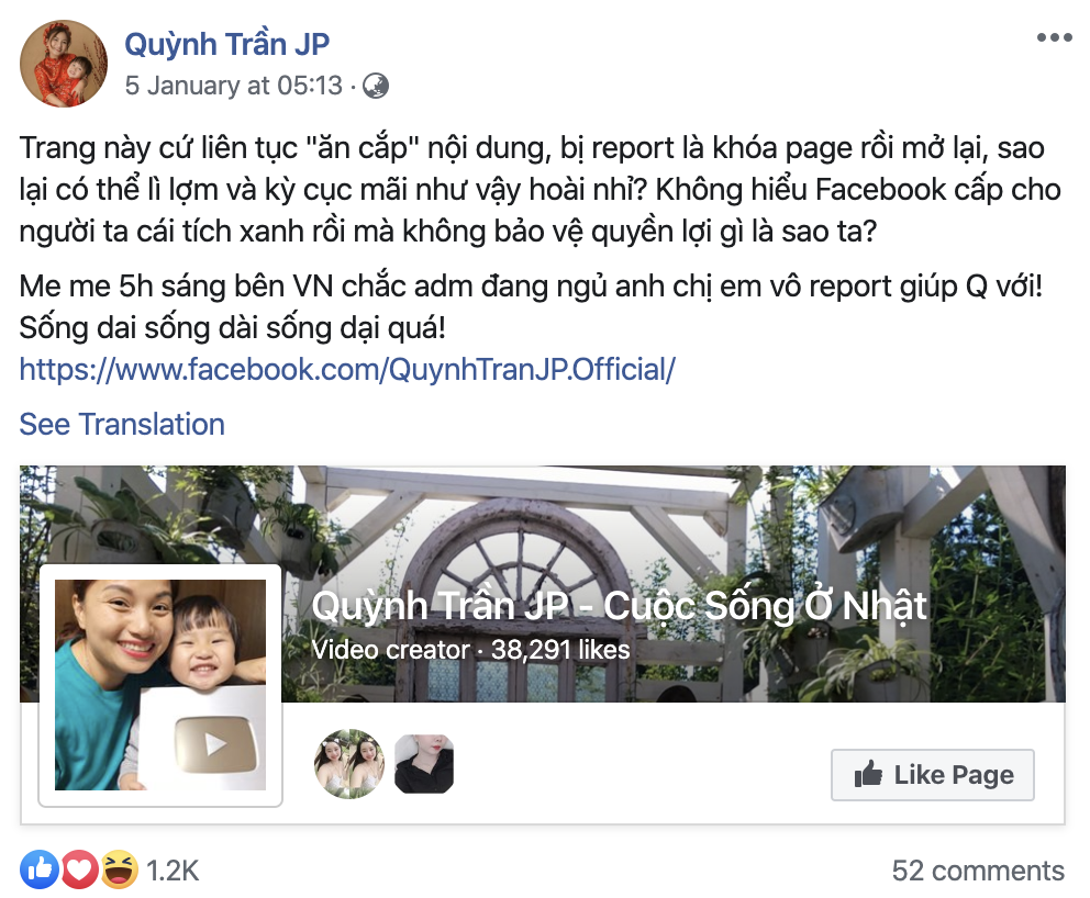 “Trang này cứ liên tục “ăn cắp” nội dung, bị report là khóa page rồi mở lại, sao lại có thể kỳ cục mãi như vậy hoài nhỉ? Không hiểu Facebook cấp cho người ta cái tích xanh rồi mà không bảo vệ quyền lợi gì là sao ta?”, Quỳnh Trần JP tỏ ra bức xúc với những kẻ giả mạo mình.