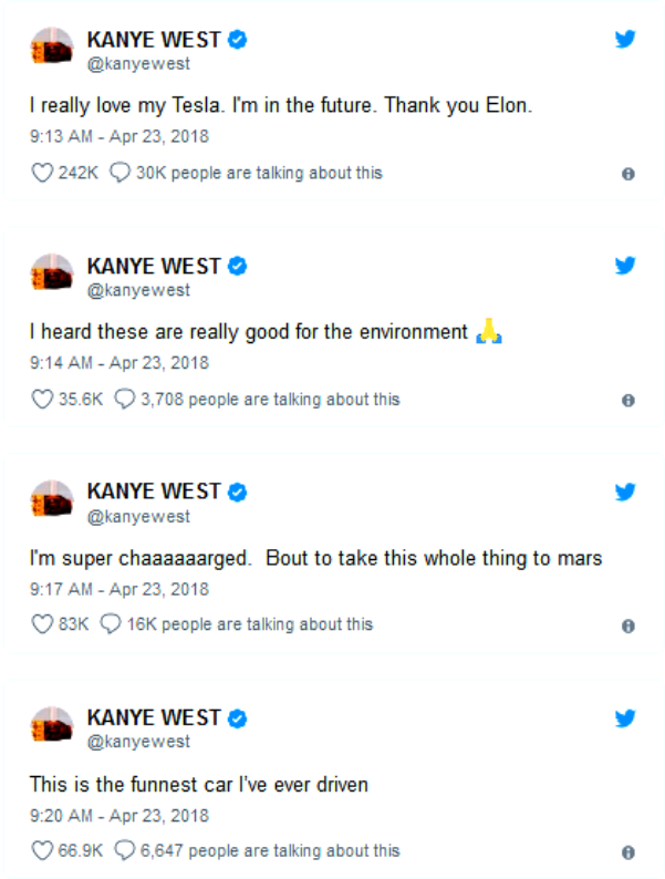 Có lẽ do rất thích mẫu xe này, nam rapper “lắm tài nhiều tật” đã đăng tải những dòng trạng thái trên tài khoản Twitter có hơn 25 triệu người theo dõi của mình để thể hiện sự yêu thích đối với Tesla Model S P100D: “Đây là mẫu xe thú vị nhất mà tôi từng lái”, “Đang tiếp năng lượng, chuẩn bị lên sao Hỏa cùng nó luôn”, “Nghe bảo đây là xe điện rất thân thiện với môi trường” và “Tôi yêu chiếc Tesla của mình quá. Đang ở tương lai. Cảm ơn nhé Elon”.