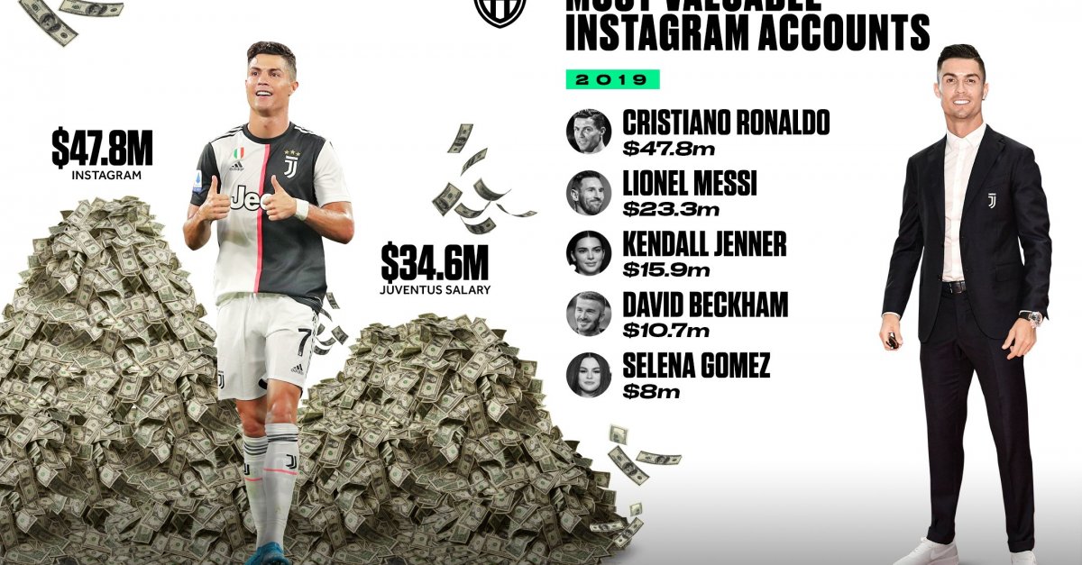 Theo thống kê của Bleacher Report Football cho thấy, Ronaldo hiện đang là người nổi tiếng kiếm tiền nhiều nhất trên Instagram. Cầu thủ khoác áo CLB Juventus thu về đến 47,8 triệu USD từ nền tảng mạng xã hội này.
