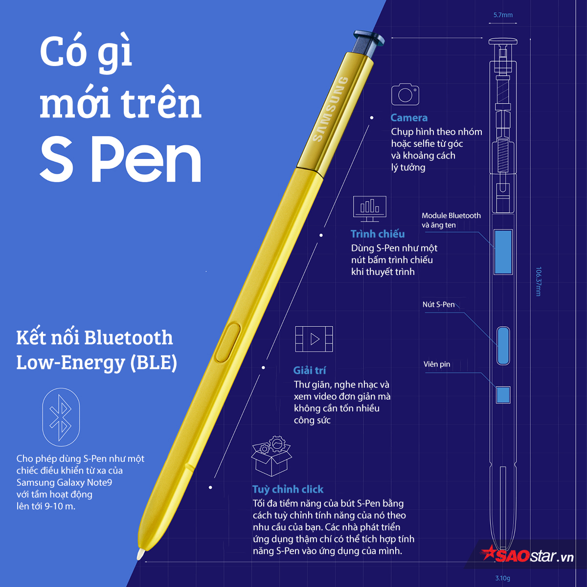 Đổi lại, S-Pen ra mắt cùng Note9 lại được nhấn rất nhiều cập nhật. Bên cạnh một phiên bản bút S-Pen đặc biệt có ngoại hình đặc biệt cùng màu vàng tươi đi kèm chiếc Note9 màu xanh dương, S-Pen mới còn được nhà sản xuất trang bị một viên pin tích hợp cùng kết nối Bluetooth. Những thay đổi này khiến S-Pen mới có thể làm được những điều chưa từng xuất hiện trước đó.