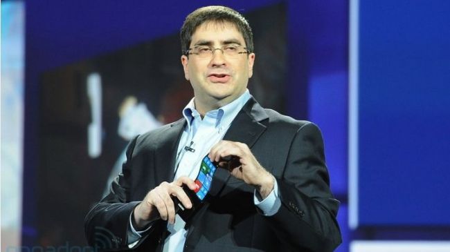 CTO của Microsoft, ông Eric Rudder đang trình bầy một nguyên mẫu màn hình dẻo của Samsung chạy Windows Phone tại hội chợ CES 2013.