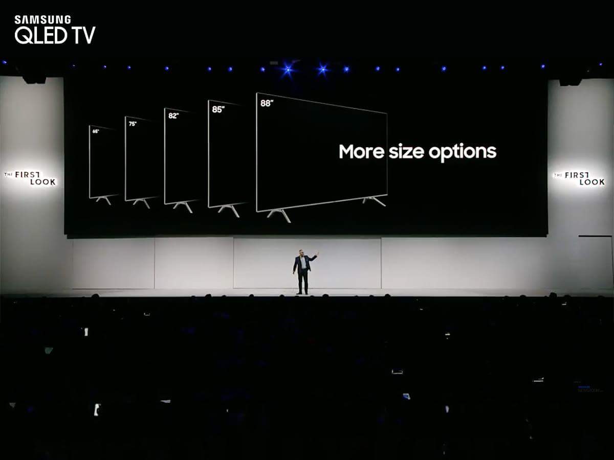 Bên cạnh đó, Samsung vẫn sẽ tập trung đầu tư và mở rộng dải sản phẩm TV màn hình siêu lớn bằng việc giới thiệu các dòng TV kích thước từ 75 inch trở lên, nhằm đáp ứng nhu cầu của người dùng (được khảo sát trong năm 2017), khi hơn 40% doanh thu của TV Samsung tại thị trường Bắc Mỹ đến từ dòng sản phẩm TV từ 65 inch trở lên và dự đoán sẽ vượt hơn 50% vào năm nay.