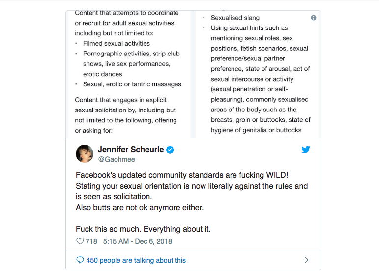 Cụ thể trang mạng xã hội do Mark Zuckerberg sáng lập sẽ giới hạn việc sử dụng hai từ “top” và “bottom” trên giao diện của hãng, hai từ ngữ liên quan đến vị trí trong chuyện giường chiếu của người đồng tính nam. Đồng đó đồng nghĩa người dùng phải chuyển cuộc hội thoại sang Messenger, hoặc nói chuyện trực tiếp với nhau.