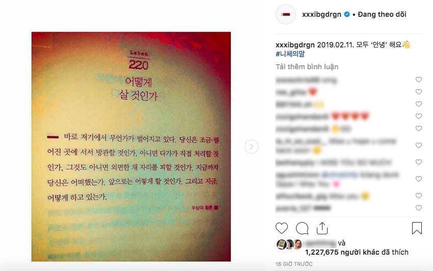 Bên cạnh đó, nhiều fan hâm mộ cũng bất ngờ khi nam rapper đình đám chọn đăng tải loạt ảnh tác phẩm của nhà triết học Nietzsche với tựa đề “Làm sao để sống”, “Đừng đặt cược vào lý tưởng quốc gia của bạn, mà là lý tưởng của chính bạn”. G-Dragon còn để lại dòng nhắn nhủ: “Ngày 11/2/2019. Xin chào mọi người #Lời răn dạy của Nietzsche”.