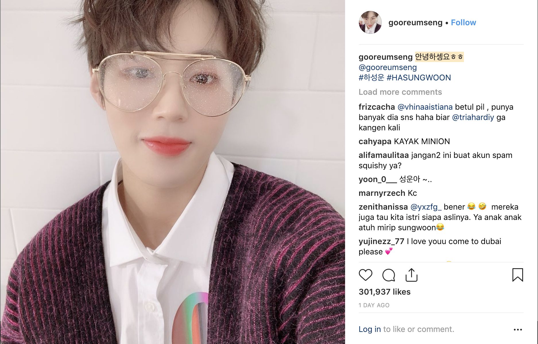 Hiện tại dù chỉ mới tạo tài khoản cách đây một ngày nhưng Instagram của Ha Sungwoon đã có đến hơn 366 ngàn người theo dõi. Về phía bản thân, anh chàng cũng đã ấn theo dõi những thành viên Wanna One hiện đã có tài khoản Insta.
