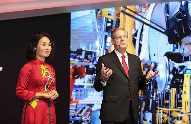 Ông James DeLuca và bà Lê Thị Thu Thuỷ tại Paris Motor Show 2018.