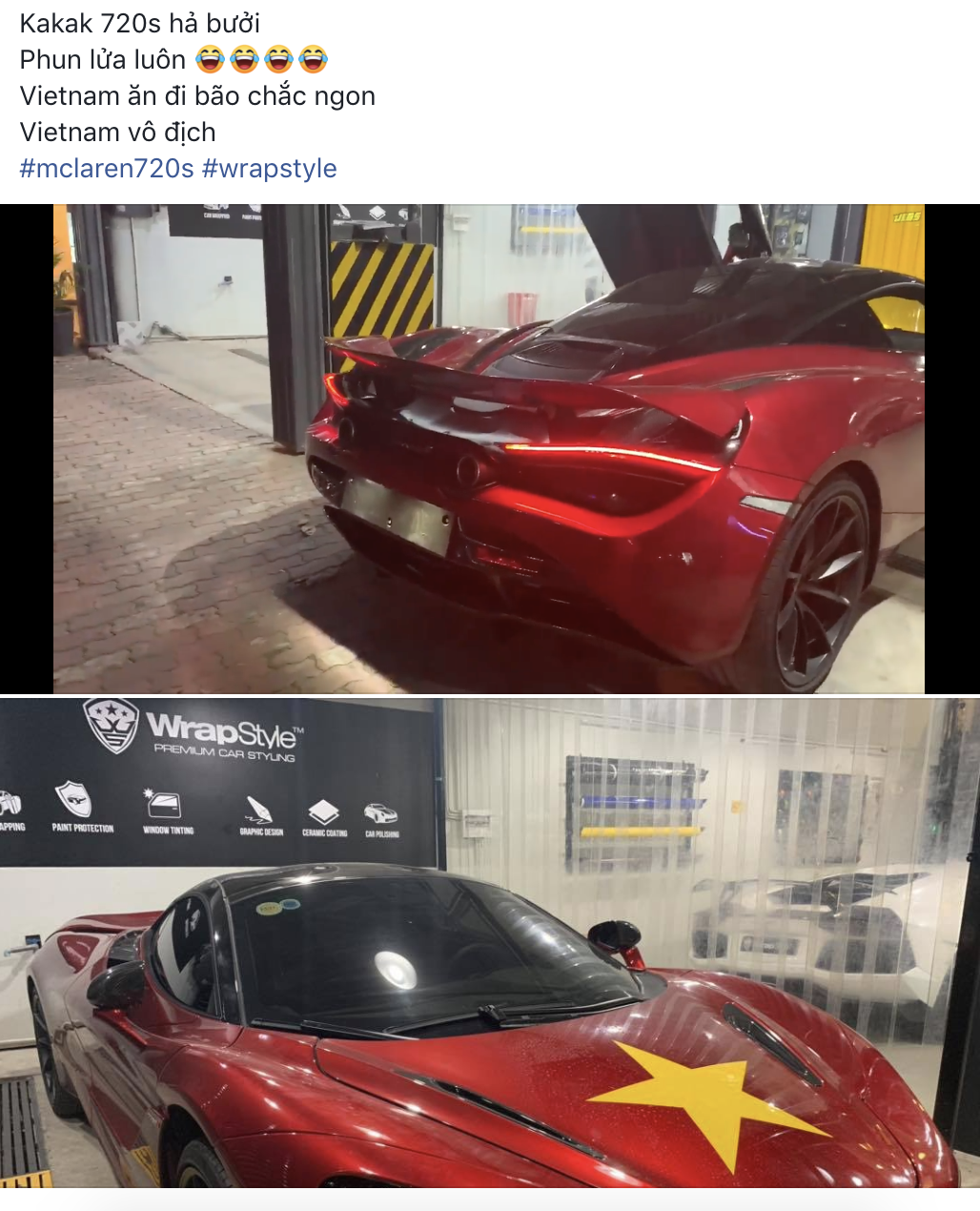 Mới đây, mạng xã hội vừa đăng tải hình ảnh siêu xe McLaren 720S đã dán thêm sao vàng lên nắp capô để cổ vũ cho tuyển Việt Nam. Do có sẵn ngoại thất màu đỏ, nên chủ nhân của siêu xe McLaren 720S này chỉ cần dán thêm sao vàng là có ngay lá cờ Việt Nam để cổ vũ cho đội tuyển Việt Nam trước trận bán kết.