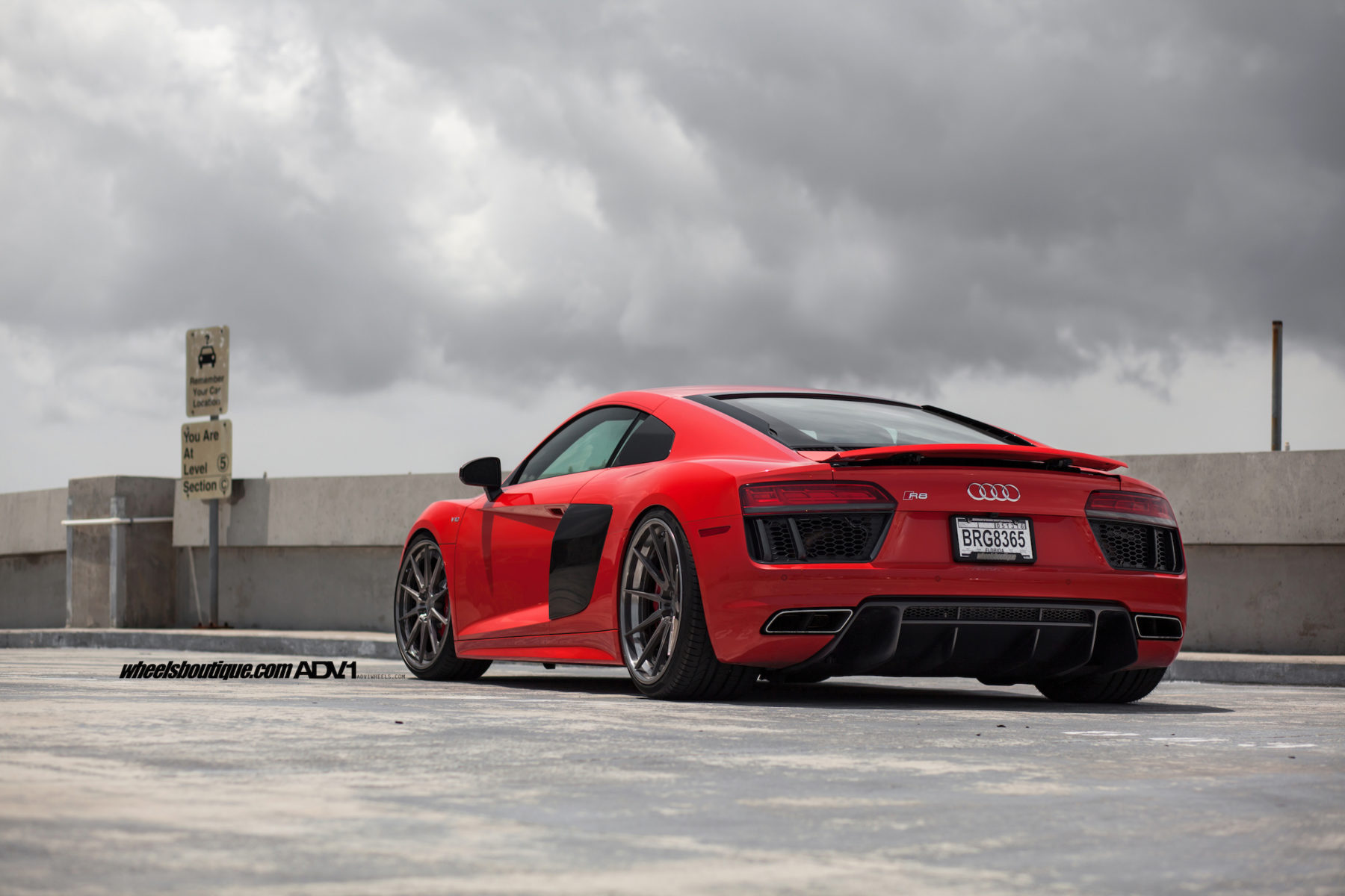 Đằng sau xe có hốc gió cỡ lớn, cản va kiểu mới và đèn hậu dạng LED. Ngoài ra, Audi R8 V10 Plus 2016 còn được trang bị cánh gió bằng sợi carbon cố định ở đuôi xe. (Ảnh: Adv1wheels)