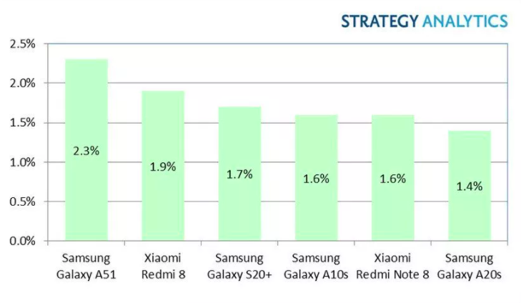 Một báo cáo khác của Canalys cũng vẽ ra một bức tranh tương tự dù kết quả liên quan đến doanh số của các dòng máy có đôi chút khác nhau liên quan đến cách đếm dữ liệu. Theo đó, Canalys đếm Remdmi Note 8 và 8T là một thiết bị và vì thế chúng xếp ở vị trí số 1. Cùng thời điểm, Galaxy A51 đứng ở vị trí số 2.