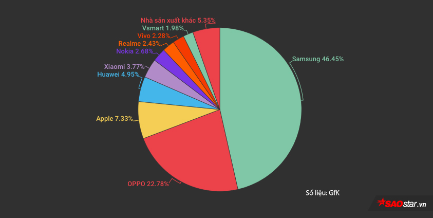 Samsung và OPPO đang là hai nhà sản xuất chiếm quá bán trong miếng bánh thị phần với lần lượt 46,45% và 22,78% thị phần. Thực tế, đây cũng là hai nhà sản xuất chăm ra điện thoại mới nhất và đồng thời cũng có nhiều hoạt động quảng bá thương hiệu nhất tại thị trường Việt Nam. Apple trong khi đó đang là nhà sản xuất có thị phần lớn thứ ba trong bốn tháng đầu năm 2019 với 7,33% thị phần. Nhiều người yêu công nghệ nhận định thực tế Apple có miếng bánh thị phần lớn hơn nhiều bởi những khảo sát như thế này thường chỉ quan tâm đến phân khúc thiết bị chính hãng. Trong khi đó, tại Việt Nam, nhiều người dùng iPhone mua chiếc máy này từ thị trường thứ cấp (máy xách tay).
