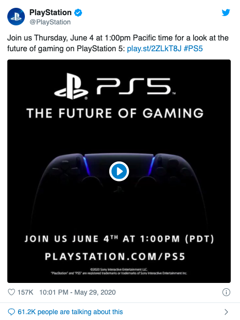 Sony mới đây đã chính thức xác nhận rằng sự kiện PlayStation 5 của hãng sẽ được tổ chức vào ngày 4/6 tới. Sony hứa hẹn đây sẽ là dịp để mọi người có được “cái nhìn về tương lai của trò chơi trên PlayStation 5.” Theo Jim Ryan, CEO và chủ tịch của Sony Interactive Entertainment, sự kiện nói trên sẽ kéo dài trong hơn 1 giờ đồng hồ và cũng sẽ nói đến “các trò chơi mà người dùng có thể tận hưởng sau khi PlayStation 5 chính thức lên kệ vào mùa mua sắm cuối năm.”