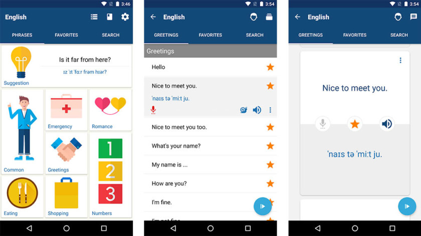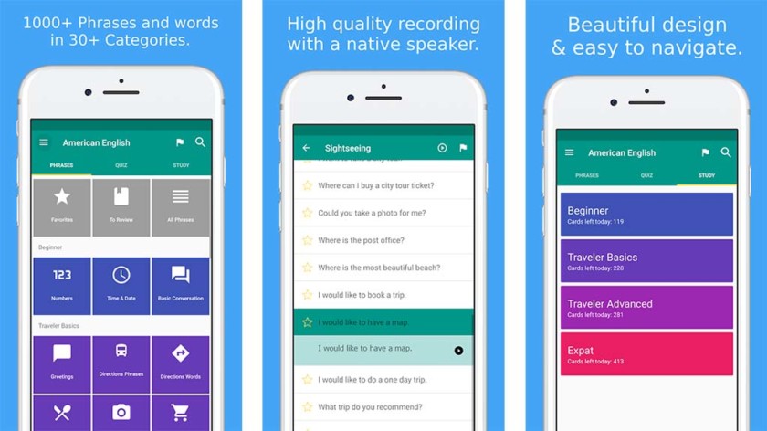 Learn English Phrases là một ứng dụng học tiếng Anh đơn giản, dễ sử dụng. Learn English Phrases có nhiều cụm từ và từ vựng tiếng Anh hữu ích. Khi bạn nhấn chạm vào một cụm từ, ứng dụng sẽ đọc từ đó to lên vì vậy bạn không cần phải đoán từ đó phải phát âm như thế nào. Và nếu bạn cảm thấy rằng ứng dụng nói quá nhanh, chỉ cần chạm vào biểu tượng con rùa để nghe những từ đó được nói chậm hơn. Nghe cách phát âm của những người bản xứ nói tiếng Anh đã được ghi âm lại sau đó ghi âm và phát lại giọng của chính bạn để thực hành kỹ năng nói tiếng Anh.