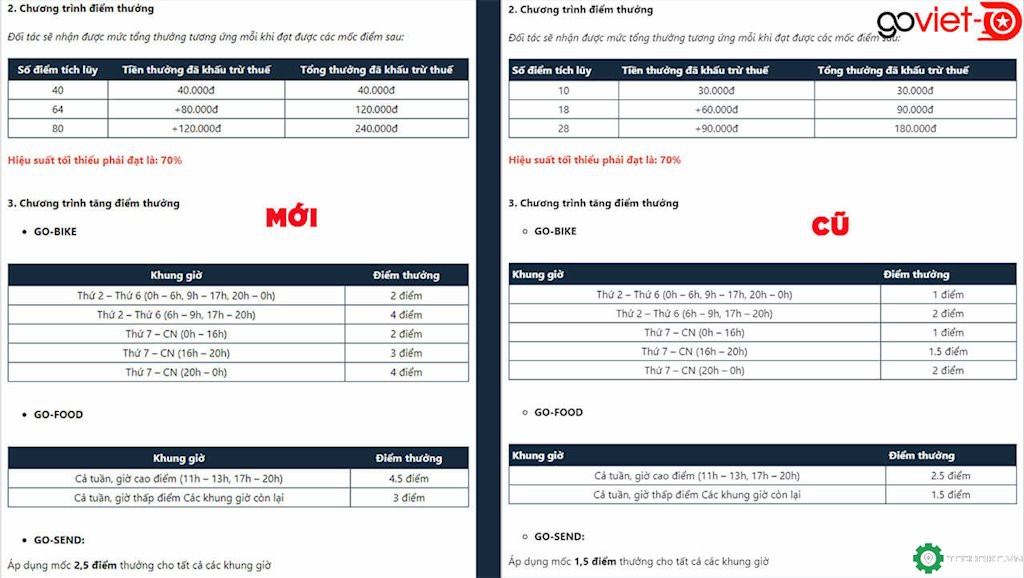 Theo tìm hiểu, với chính sách cũ của cách tính thưởng mà Go-Viet áp dụng cho các tài xế là 30.000 đồng, 90.000 đồng và 180.000 đồng cho các mức điểm tích luỹ là 10, 18 và 28 điểm. Thế nhưng, theo chính sách mới, dù mức thưởng được tăng lên các mức 40.000 đồng, 120.000 đồng và 180.000 đồng tuy nhiên mức điểm tích luỹ là rất cao và khó đạt được, theo nhiều tài xế, là 40 điểm, 64 điểm và 80 điểm.