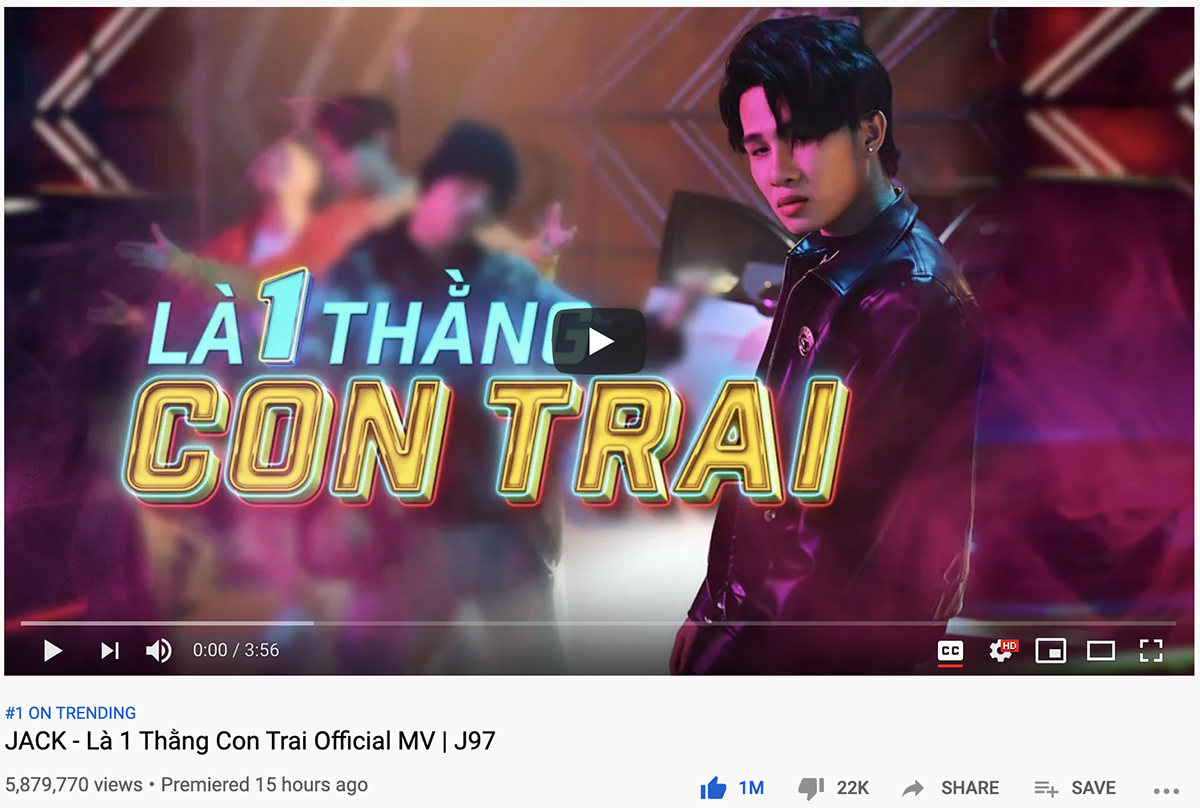 Chỉ sau 15 giờ ra mắt, MV “Là 1 Thằng Con Trai” của Jack đã đạt mốc hơn 1 triệu like, top 1 trending YouTube và số lượt xem cũng gần 6 triệu.