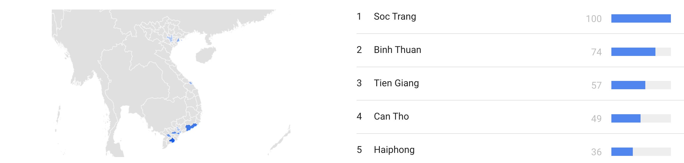 Trong khi đó, lượt tìm kiếm từ khoá “Là 1 Thằng Con Trai” cũng tăng vọt tại thời điểm MV ra mắt. Dữ liệu của Google cho thấy, những tỉnh thành tìm nghe nhiều nhất MV mới của Jack là Sóc Trăng, Bình Thuận, Tiền Giang, Cần Thơ và Hải Phòng.