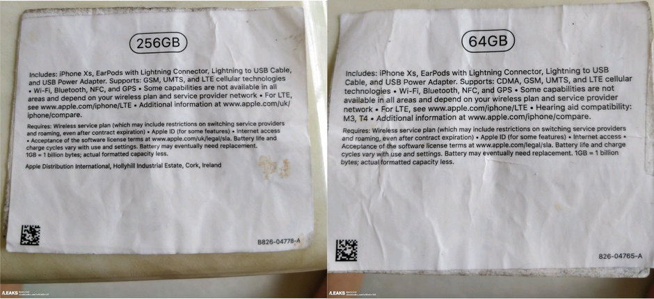 Hình ảnh được cho là hộp máy iPhone Xs rò rỉ với hai phiên bản 64 GB và 256 GB bộ nhớ trong.