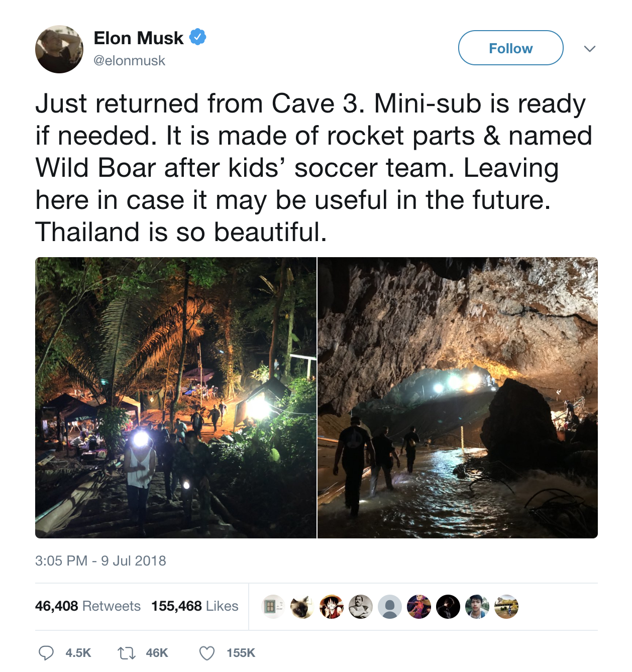 “Vừa bước từ hang số 3 ra. Chiếc tàu ngầm cỡ nhỏ của chúng tôi đã sẵn sàng để sử dụng khi cần thiết. Nó được đặt tên là Heo Rừng, giống như tên của đội bóng đang bị mắc kẹt trong hang. Chiếc tàu ngầm này được làm từ các bộ phận của tên lửa Falcon 9 và sẽ được để lại Thái Lan để phòng trường hợp họ cần sử dụng trong tương lai.”