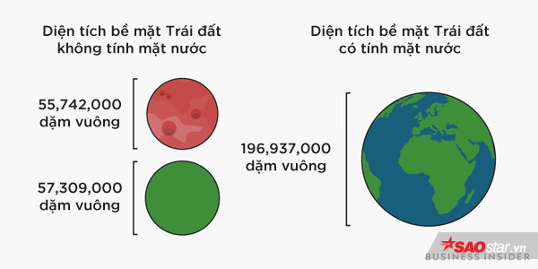 Trái đất lớn hơn Sao Hỏa khá nhiều. Tuy nhiên nếu không tính diện tích bề mặt nước thì diện tích về mặt đất của hành tinh xanh cũng chỉ tương đương hành tinh đỏ. Trong trường hợp bạn chưa biết, 71% Trái đất là được bao phủ bởi nước.