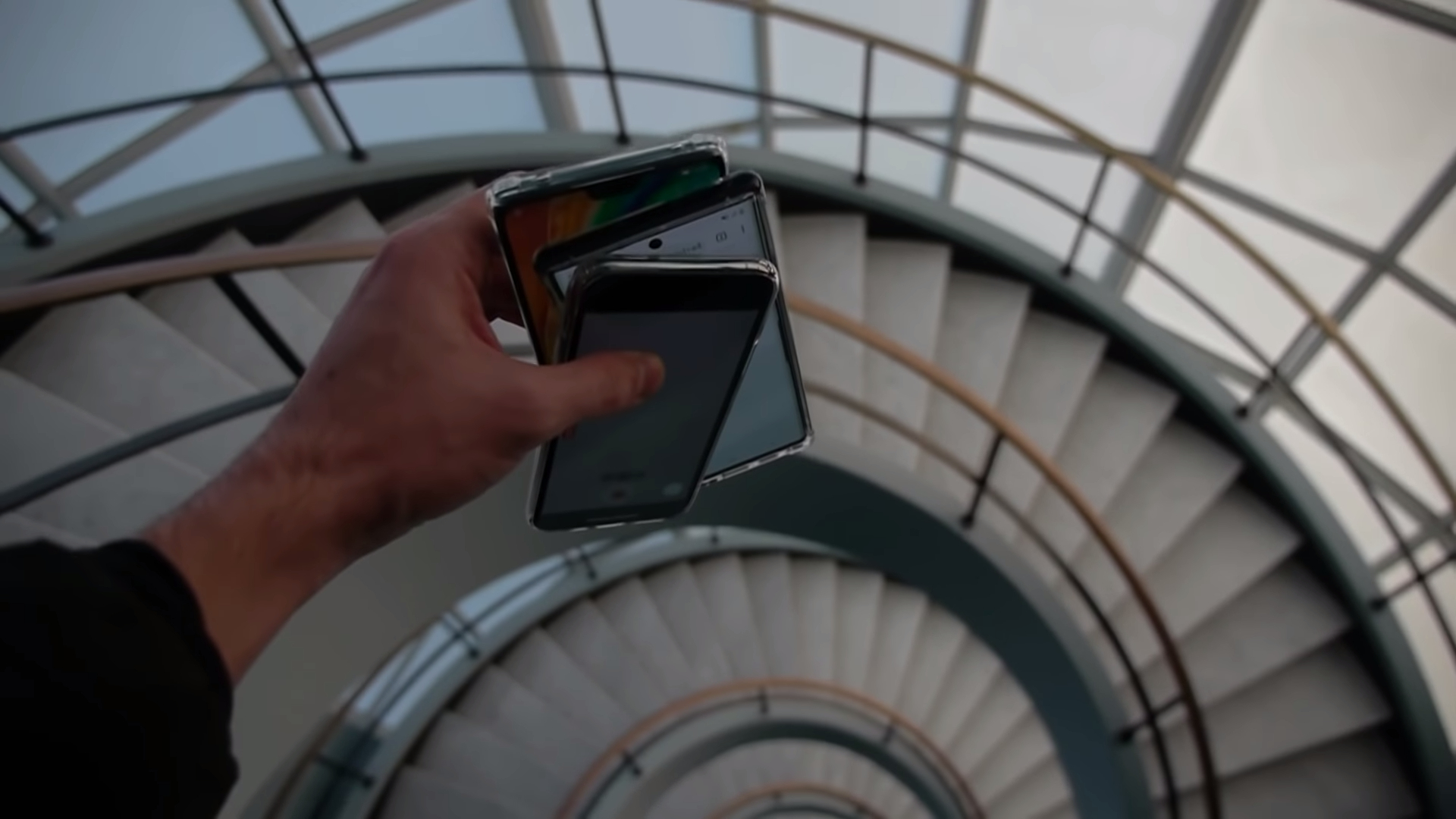 Sau khi đã mang xong ốp lưng nhựa cho 3 chiếc smartphone, TechRax bắt đầu thả chúng từ độ cao hàng chục mét. (Ảnh: TechRax)