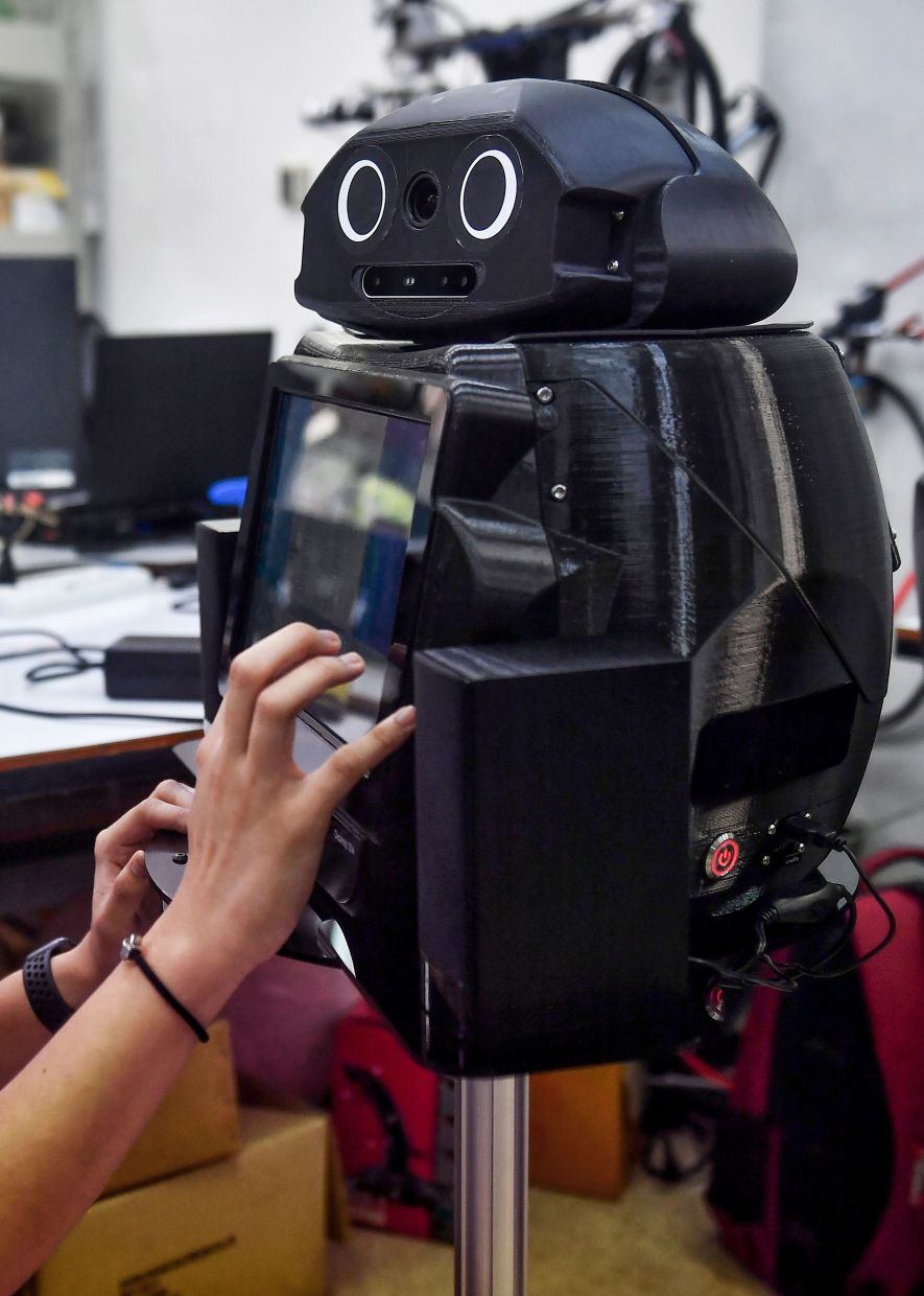 Một sinh viên kỹ thuật Thái Lan đang cài đặt phần mềm cho một chú robot ninja được dùng để sàng lọc và quan sát bệnh nhân nhiễm virus corona tại Trung tâm Công nghệ Robotics thuộc Đại học Chulalongkorn ở Bangkok. (Ảnh: Lillian SUWANRUMPHA / AFP)