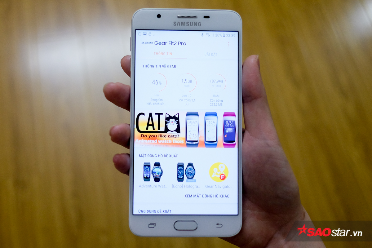 Trên ứng dụng sẽ hiển thị đầy đủ các thông tin về Gear Fit2 Pro, đồng thời có nhiều tuỳ chọn để thay đổi giao diện của vòng đeo.