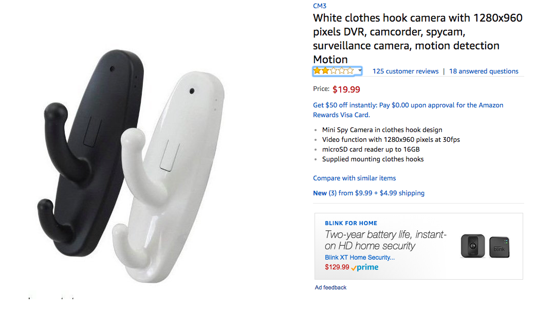 Một trong những ví dụ cho điều này là những chiếc camera tí hon được giấu kín trong những món đồ quen thuộc như chiếc móc treo đồ chẳng hạn. Điều đáng nói là móc treo đồ thường được đặt ở những nơi nhạy cảm và riêng tư, ví dụ như phòng khách sạn, phòng thay đồ, thử đồ hay thậm chí là nhà vệ sinh công cộng.