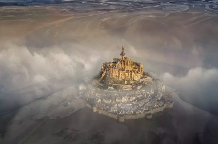 “Hòn đảo Mont Saint Michel nổi tiếng trong một buổi sáng mờ sương.” | Deryk Baumgärtner / SkyPixel.