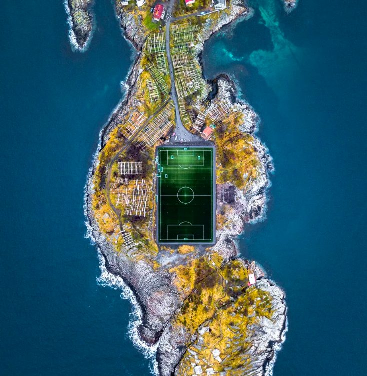 “Lofoten,” hình ảnh từ trên cao của một sân bóng nằm trên hòn đảo thuộc Na-uy Lofiten. | 圆猪笔.