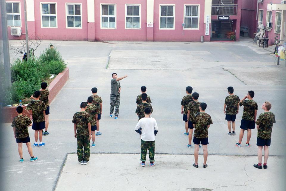 Jamie Fullerton (ngoài cùng bên phải hàng cuối cùng) nhận hướng dẫn cùng các bệnh nhân khác ngoài sân một trung tâm điều trị nghiện Internet ở Trung Quốc.
