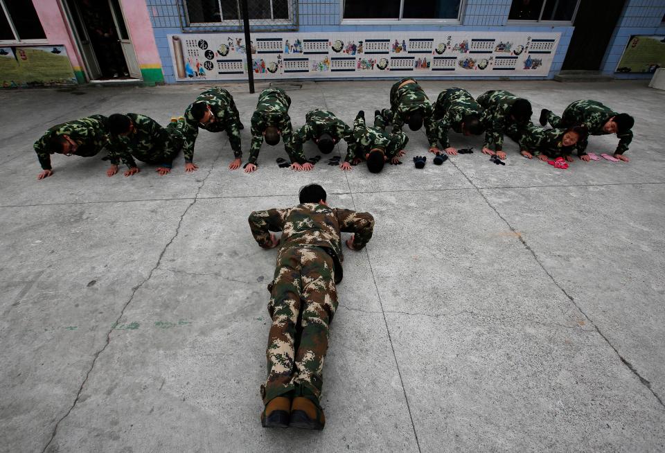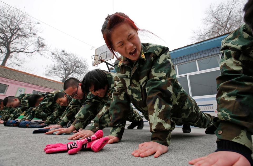 Một cô gái cau mày khi cố gắng thực hiện nốt bài chống đẩy tại Qide Education Center ở Bắc Kinh.