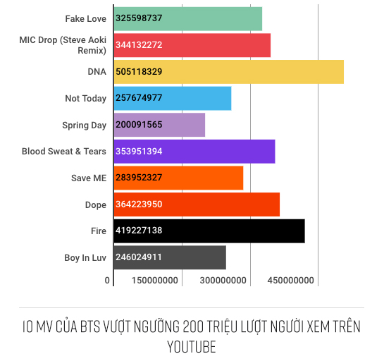 Ở thời điểm hiện tại, BTS cũng chính thức trở thành nhóm nhạc Hàn Quốc có nhiều MV đạt trên 200 triệu lượt xem trên YouTube nhất. Trước đó ít ngày, BTS cũng ghi tên mình vào lịch sử ngành công nghiệp Hàn Quốc khi MV “DNA” khiến 7 anh chàng này trở thành nhóm nhạc Hàn Quốc đầu tiên sở hữu MV vượt ngưỡng 500 triệu lượt xem trên nền tảng video lớn nhất hành tinh.