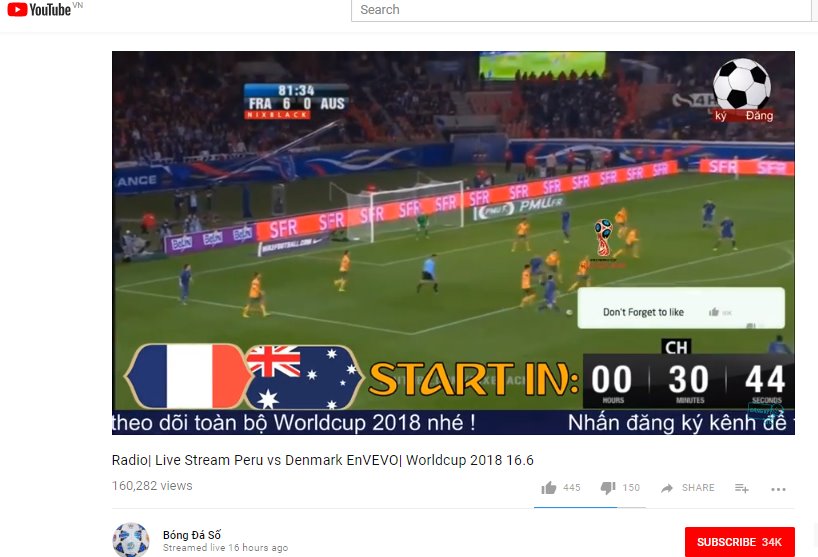 Như ICTnews đã đưa tin, ngay trong lễ khai mạc và trận mở màn World Cup 2018 và tối 14/6/2018, đã có hàng trăm tài khoản mạng xã hội Facebook, YouTube và hàng trăm trang web đã livestream hình ảnh của World Cup 2018 lên Internet. Đây là hành vi vi phạm nghiêm trọng bản quyền phát sóng World Cup 2018.