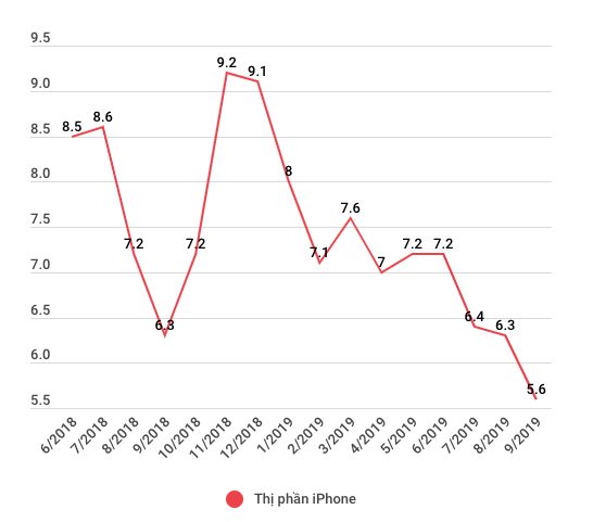 Theo số liệu từ công ty nghiên cứu thị trường GfK, thị phần của iPhone tại Việt Nam đang trên đà lao dốc trong năm 2019. Theo đó, Apple chỉ dành được 5,6% miếng bánh thị trường di động Việt trong tháng 9 năm nay. Con số này giảm đều qua các tháng từ đỉnh cao 7,6% thị phần vào tháng 2 năm nay, cũng theo số liệu của GfK.