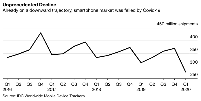 Số lượng smartphone bán ra trên toàn cầu đang giảm với tốc độ nhanh chưa từng có trong quý một năm nay trước những ảnh hưởng sâu rộng của COVID-19. Cụ thể, trong ba tháng đầu năm nay, lượng smartphone bán ra đã chạm mốc 275 triệu máy, theo hai đơn vị nghiên cứu thị trường Strategy Analytics và IDC, lần lượt giảm 17% và 11% so với cùng kì năm ngoái. Cả hai công ty này đều cho rằng những con số tồi tệ trên là kết quả của chuỗi cung ứng gián đoạn và nhu cầu thị trường giảm sút do virus corona chủng mới.