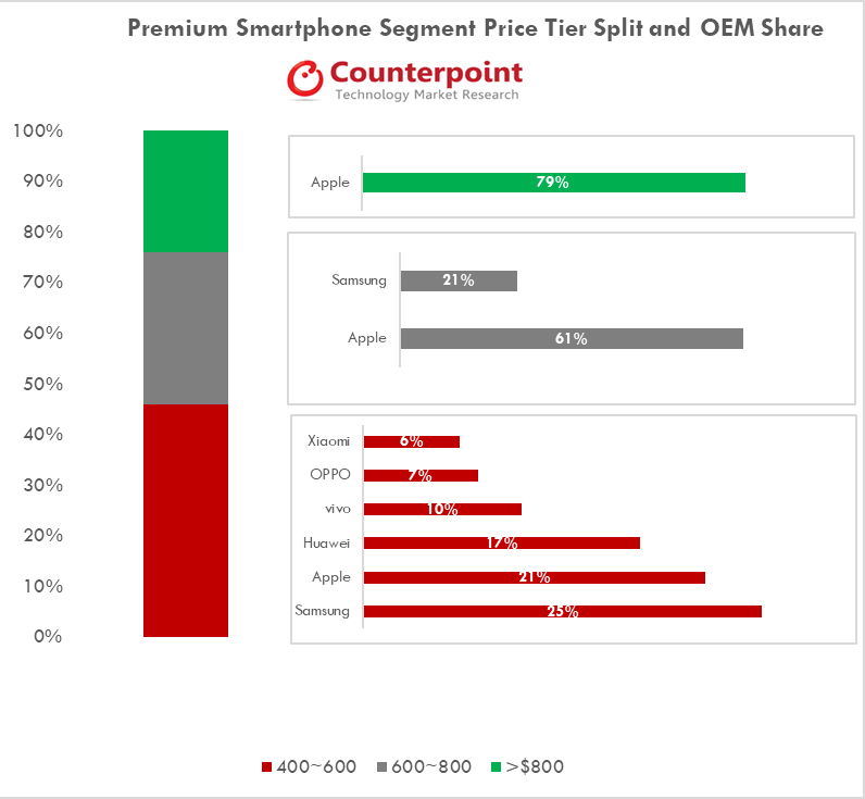 Theo CounterPoint Research, thị phần toàn cầu của Apple với điện thoại có giá trên 800 USD lên tới 79%. CounterPoint rất tiếc không đưa ra thông tin liên quan đến việc 21% thị trường còn lại thuộc về những thương hiệu nào. Dù vậy, AndroidAnthority dự đoán một trong những cái tên xứng đáng xuất hiện có thể làm Samsung hoặc Huawei. Ở phân khúc smartphone có tầm giá từ 600 USD đến 800 USD, Apple chiếm tới 61% thị phần trong khi đó hãng smartphone cũng có một thị phần đáng kể khác được CounterPoint Research là Samsung với 21% miếng bánh thị phần.