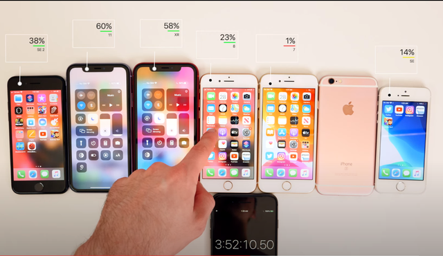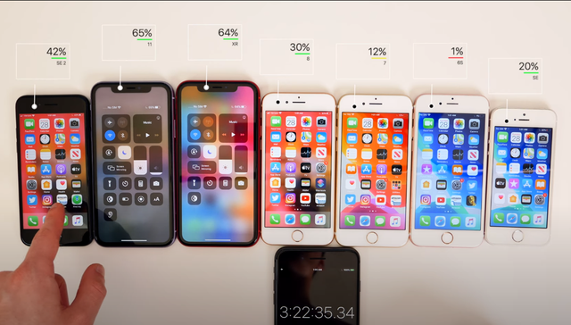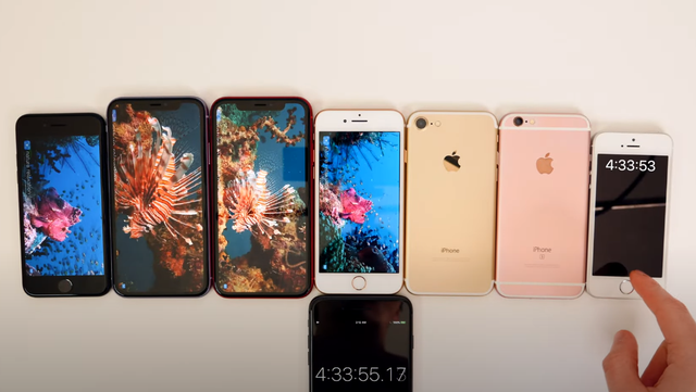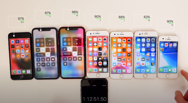 Để kiểm chứng thời lượng pin của những chiếc iPhone này, YouTuber Brandon Butch đã cho các thiết bị cùng đồng loạt phát video. Sau khoảng 1 tiếng đồng hồ, mẫu iPhone SE 2020 chỉ tiêu tốn khoảng 3% pin, tương đương với iPhone 11. Trong khi đó, với iPhone 8, iPhone 7, iPhone 6s và iPhone SE 2016 lượng pin đã bị hao hụt từ 7-12%.
