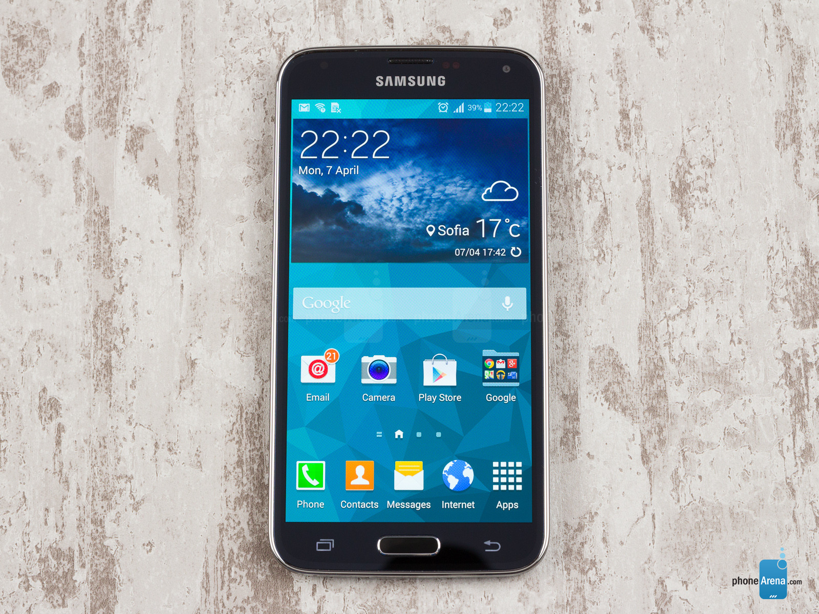 Samsung Galaxy S5 được trang bị màn hình 5,1 inch độ phân giải 1.080 x 1.920 pixel cùng mật độ điểm ảnh 432 ppi.Máy sử dụng con chip Snapdragon 801 cùng RAM 2 GB và bộ nhớ trong 32 GB cùng với đó là dung lượng pin 2.800 mAh. Thông số camera sau của chiếc máy được tiếp tục lên lên mức 16 MP trong khi camera trước có thông số 2,1 MP.