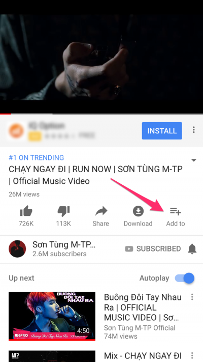 Đầu tiên, hãy tìm đến video mà bạn muốn xem lặp đi lặp lại trong ứng dụng YouTube và nhấn Add To.