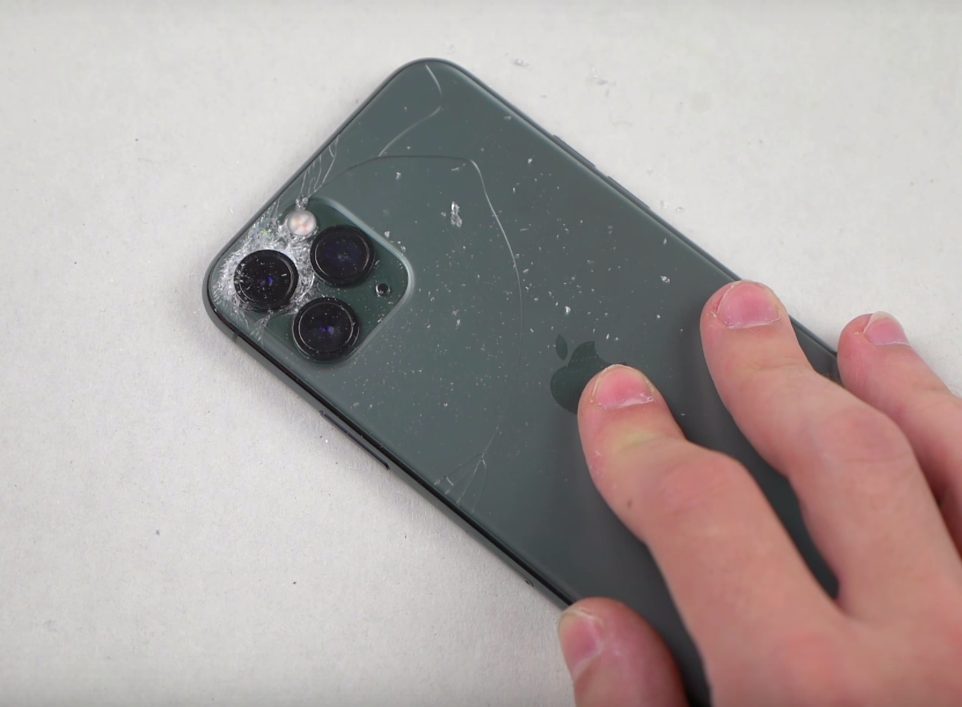 Khi thử nghiệm đập búa lên mặt trước iPhone, TechRax nói rằng chiếc điện thoại của Apple bắt đầu bị tác động nứt màn hình dưới cú đập với lực trung bình. Màn hình mặc dù bị nứt mạnh nhưng vẫn sử dụng được sau những cú đập đầu tiên.