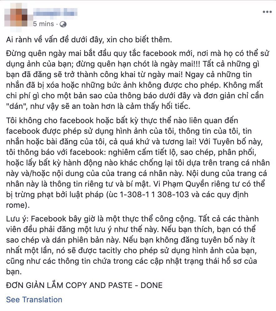 Tuy nhiên, theo đại diện Facebook cho biết “đây chỉ là thông tin giả mạo và là một trò lừa người dùng”. Mạng xã hội này khẳng định, người dùng tại Việt Nam đang bị nhiều kẻ gian lợi dụng khi đăng tải lại dòng thông báo vô nghĩa nhằm mục đích bảo vệ thông tin cá nhân. Nếu tinh ý bạn sẽ phát hiện điều bất thường trong câu khuyến khích mọi người chia sẻ nội dung này: “Nếu sao chép và đăng lại bài này lên trang cá nhân, dữ liệu của bạn sẽ được bảo vệ”.